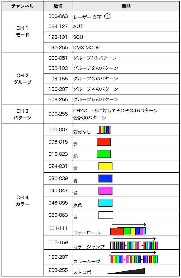| パターン数は80ありますが、これを上記のDMXチャンネルの組み合わせによりほぼ無限大のパターンが自動でも照射されます。 勿論DMXでコントロールすることも出来ます。 サウンドアクティブ機能も付いているので音により反応させて照射することも出来ます。 |