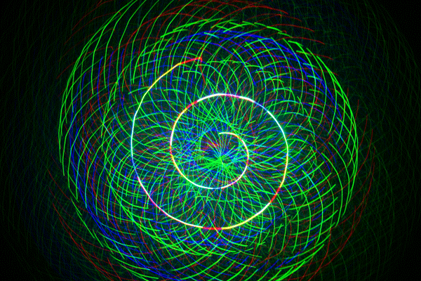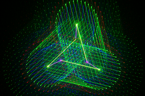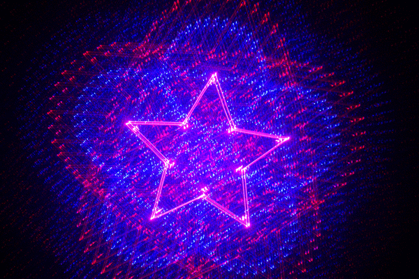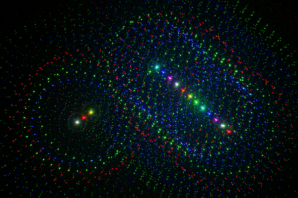 壁面に向ければ色々な不思議なパターンが次々に出て楽しめます。また、スモークを炊き空間にレーザービームを照射すれば今までの単なるビームと違い数多くの細かいビームなどが出て派手な演出も出来ます。